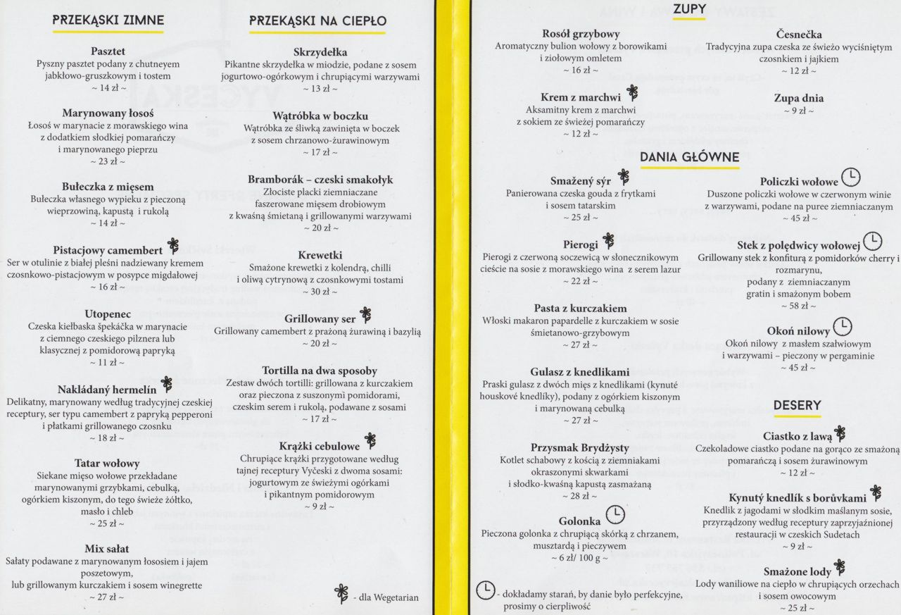 W menu tradycyjne czeskie specjały, m.in. smažený sýr, gulasz z knedlikami, svičkova, nakládaný hermelín, bramborák oraz pyszny deser - kynutý knedlík s borůvkami.
